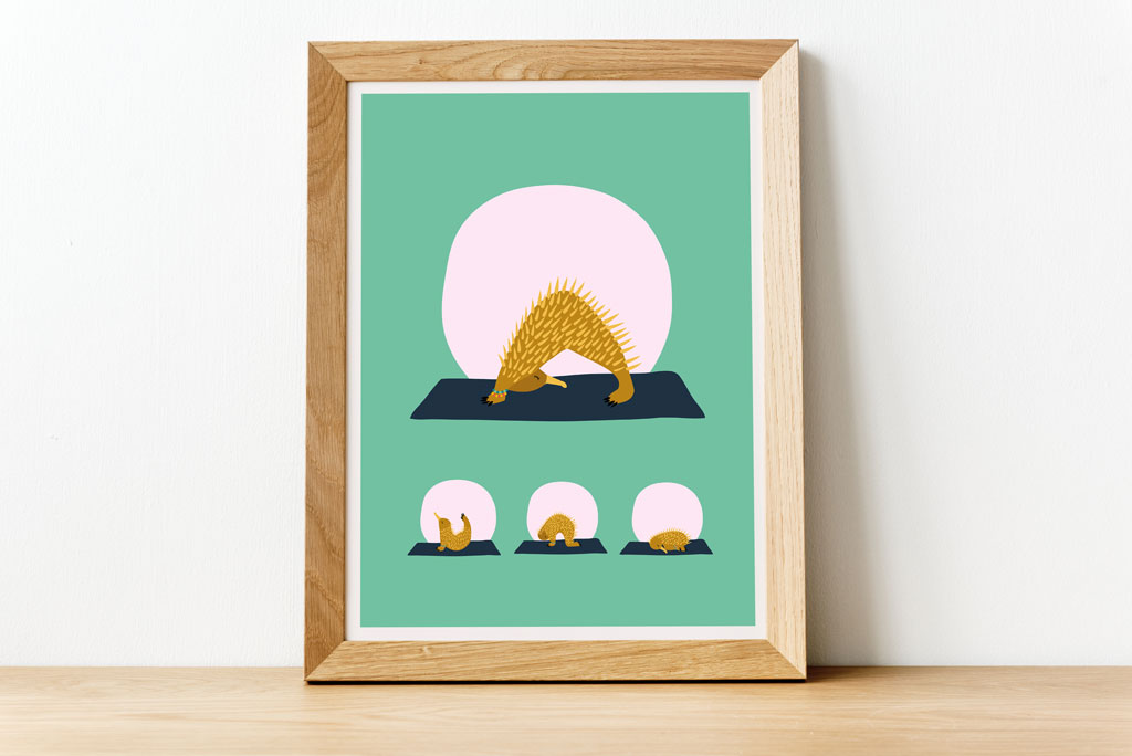 Poster 4: Kim, the echidna practising the Downward facing dog pose, the Bow pose, the Cat pose and the Child pose.