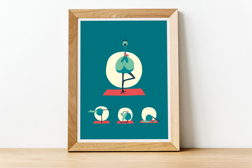 Poster 2: Ellis, the emu practising the Tree pose, Warrior 3 pose, the Camel pose and the Plow pose.