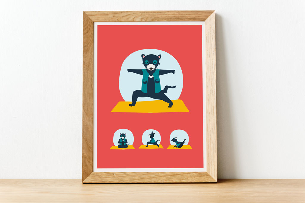 Poster 3: Terri, the Tasmanian devil practising the Warrior 2 pose, the Lotus pose, the Boat pose and the Warrior 1 pose.